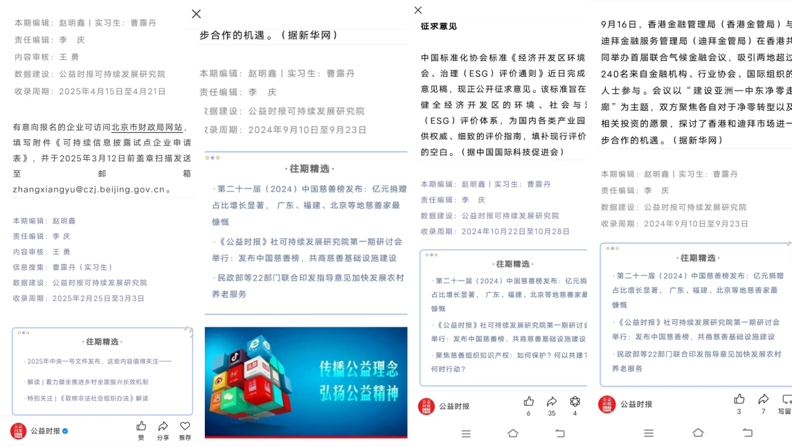 校外实践中,她凭借扎实的专业功底与出色的写作能力,成为带教教师招收的首位播音专业实习生,于民政部主管的公益时报社开展实习。在为期 11 个月的实习期间,她作为新闻采编实习生、研究院研究助理共计撰写 20 篇 ESG 周刊稿件及深度文章,阅读量突破万次;同时作为《ESG与公益》首位主播,策划并发布 8 期有声节目,实现文字创作与音频传播的双向突破。