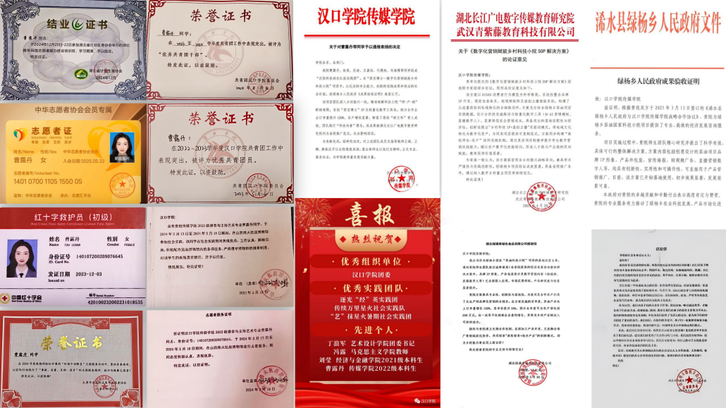 志愿于心,奉献于行。大学期间,她深耕公益事业,累计志愿服务时长达 314 小时,以炽热初心在公益沃土上深耕不辍,荣获2023 年湖北省暑期“三下乡”社会实践活动先进个人荣誉称号。她积极参与 “2023 年暑伴计划青少年心理健康成长营”,为青少年心理健康播撒温暖阳光;扎根社区一线开展志愿服务,为基层治理注入青春动能;投身 “云朵家园・罕见病脊柱裂病友大会国内大型专家义诊” 活动,为弱势群体撑起希望之伞;走进詹天佑故居纪念馆弘扬民族光荣精神,驻足山西烽火抗战博物馆用声音践行文化担当,深入崇岭村开展助农行动赋能乡村发展。她用无数个扎根一线的志愿服务瞬间,生动诠释 “奉献、友爱、互助、进步” 的志愿精神内核,书写了个人成长与社会价值同辉的青春华章!