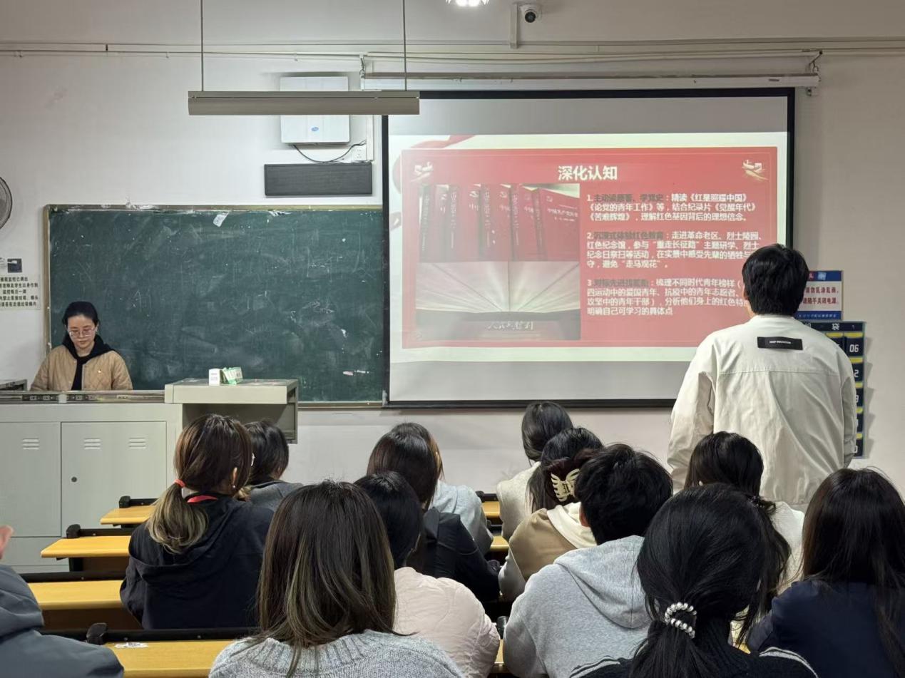 2025年11月14日中午,传媒学院党总支在二号教学楼2221教室开展第42期入党积极分子主题教育活动。本次活动以“缅怀先烈英魂,赓续红色基因”为主题,由汤晓雅老师主讲专题党课,旨在引导入党积极分子从先烈事迹中感悟红色力量,传承红色基因,明确新时代青年的使命担当与践行路径。