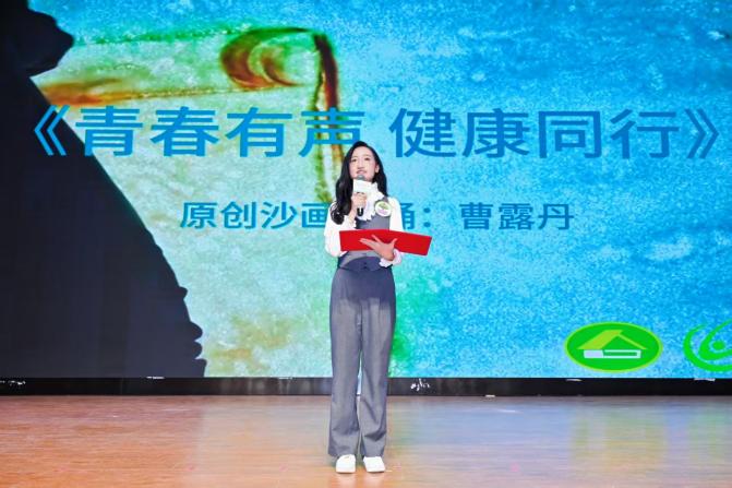 此外,她还呈现了原创沙画朗诵作品《青春有声 健康同行》。诗意的沙画画面配合深情朗诵,既道出了青春期的悸动与迷茫,也赞颂了同伴教育为年轻生命驱散彷徨的温暖力量,深深打动了现场评委与观众。主持人提问环节,问起选题的初心曹露丹表示:社团在计生协支持下不仅开展校内活动,更深入中学与乡村开展同伴教育和美育课程,活动开展时关注到部分地区学生存在生理知识专业普及的需求,所以希望借助此次官方平台更好科普专业知识,真正做到为爱发声。