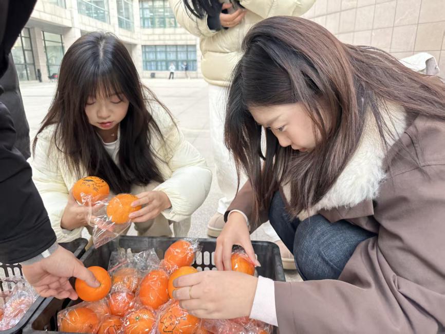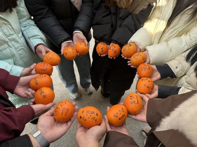 橙子,因与“成”同音,自古便寄托着“心想事成”“马到功成”的美好期盼。我们送出的不单是水果,更是一份被赋予创意与祝福的寓意之礼。每一个橙子上的手绘图案,都以温暖而独特的笔触,描摹着对学长学姐考研征程的深切祝愿。这份礼物,既是对你们潜心苦读、执着追梦的诚挚致敬,亦是对你们此战告捷、成功“上岸”的殷切期盼——愿所有汗水不被辜负,愿一切努力皆有回响。