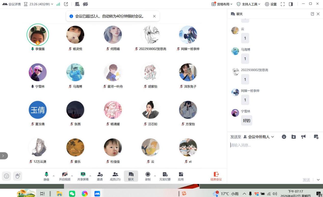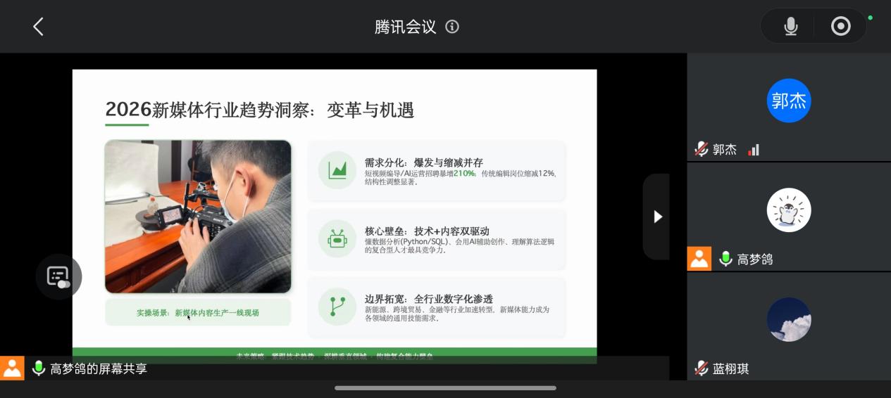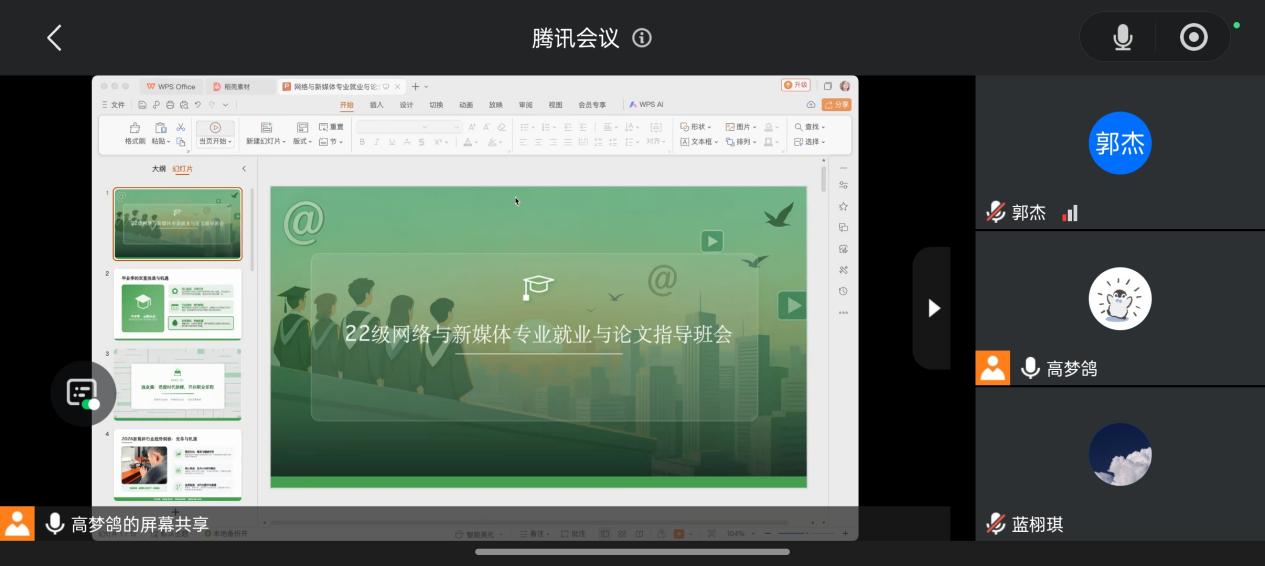 为切实帮助毕业班学生解决求职就业与毕业论文写作中的实际困难,提升毕业生就业竞争力与学术写作能力,近日,汉口学院传媒学院专职教师、网络与新媒体班主任李强强老师与网络与新媒体班主任高梦鸽老师共同组织了两场线上专题会议,分别聚焦“毕业班就业指导”与“毕业论文写作辅导”两大主题。两场会议通过腾讯会议平台举行,吸引了学院毕业班学生广泛参与,反响热烈。