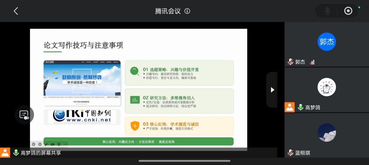 高梦鸽老师则重点分享了论文写作的时间管理技巧和查重降重方法。她建议同学们制定详细的写作计划,分阶段完成开题、初稿、修改、定稿等环节,并主动与指导老师保持沟通。在学术规范方面,她特别强调了引用规范与学术诚信的重要性,提醒学生严格遵守学术道德,杜绝抄袭和代写行为。