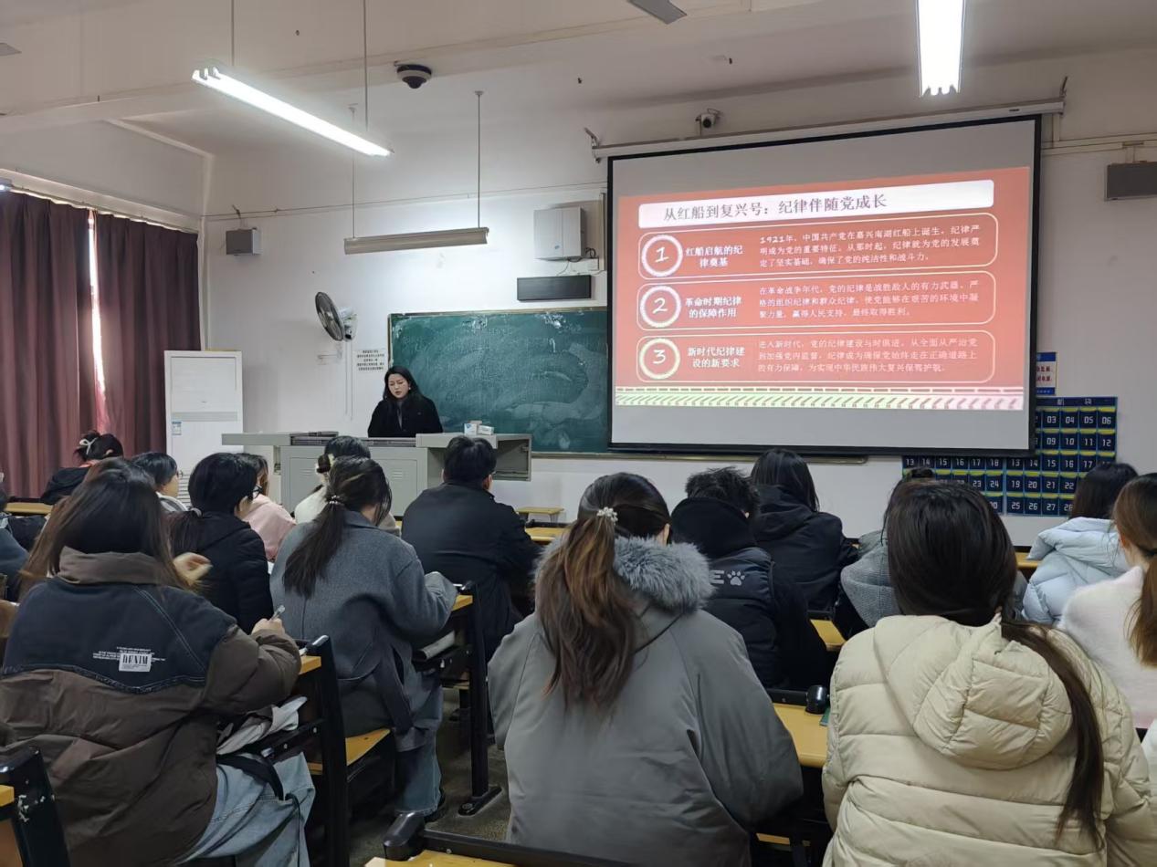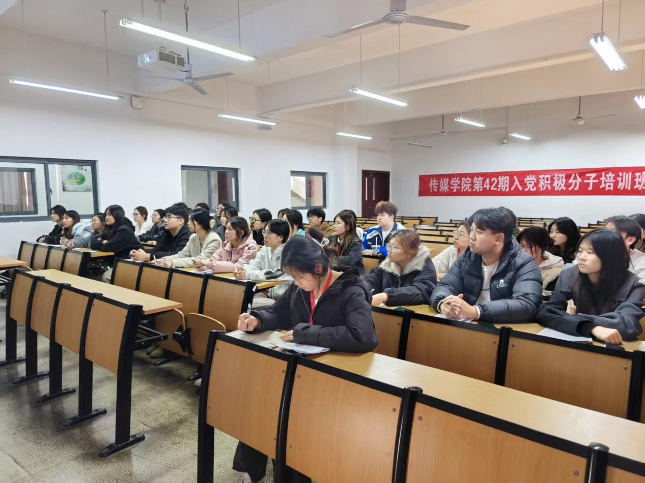 2025年11月28日中午12:10传媒学院党总支在二号教学楼2223教室举办“学纪懂权明方向,知行互促砺党性”主题教育课,由传媒学院党总支书记刘德月书记主讲,传媒学院第42期入党积极分子全体参加。