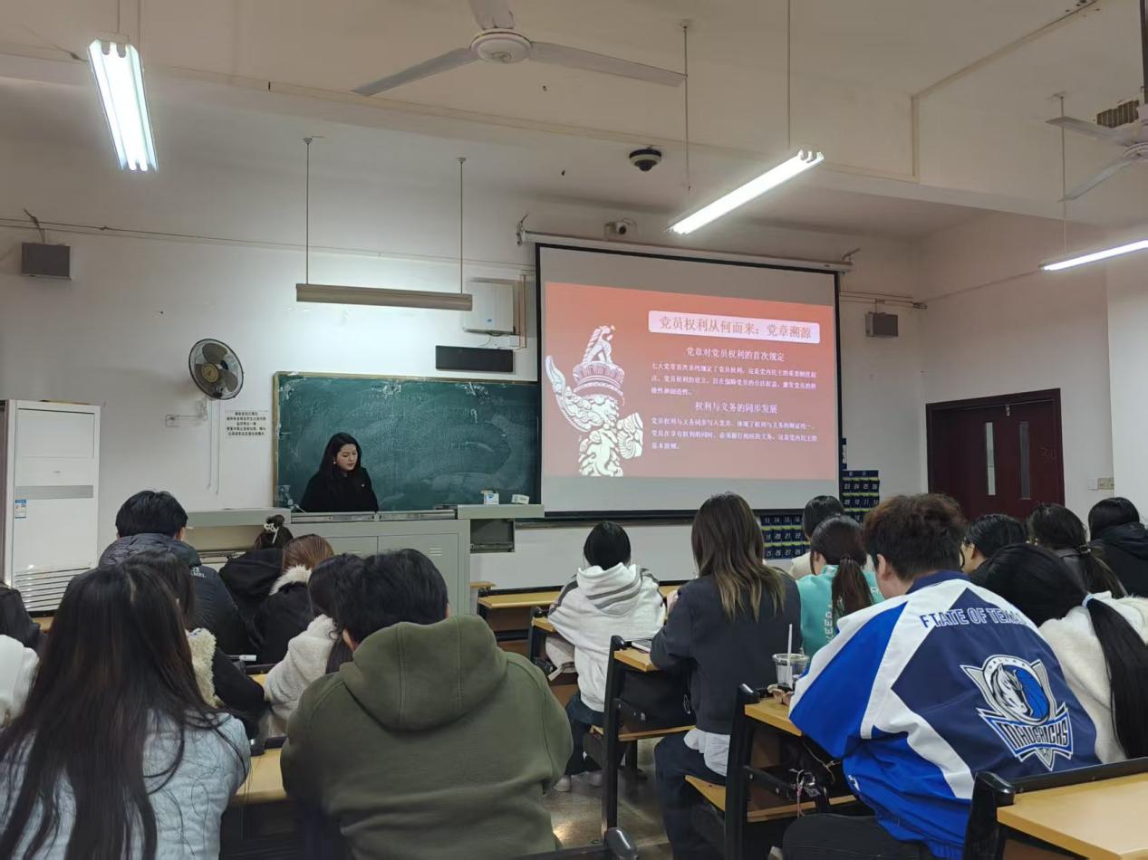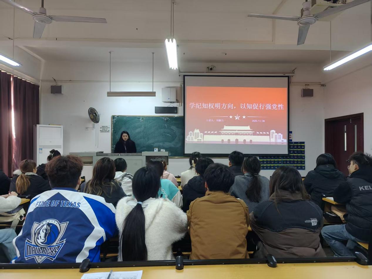 2025年11月28日中午,传媒学院党总支在二号教学楼2223教室开展以“学纪知权明方向 以知促行强党性”为主题的专题党课,由传媒学院党总支书记刘德月主讲专题党课,旨在为引导入党积极分子强化纪律意识、明晰权利义务、锤炼党性修养传承红色基因,明确新时代青年的使命担当与践行路径。