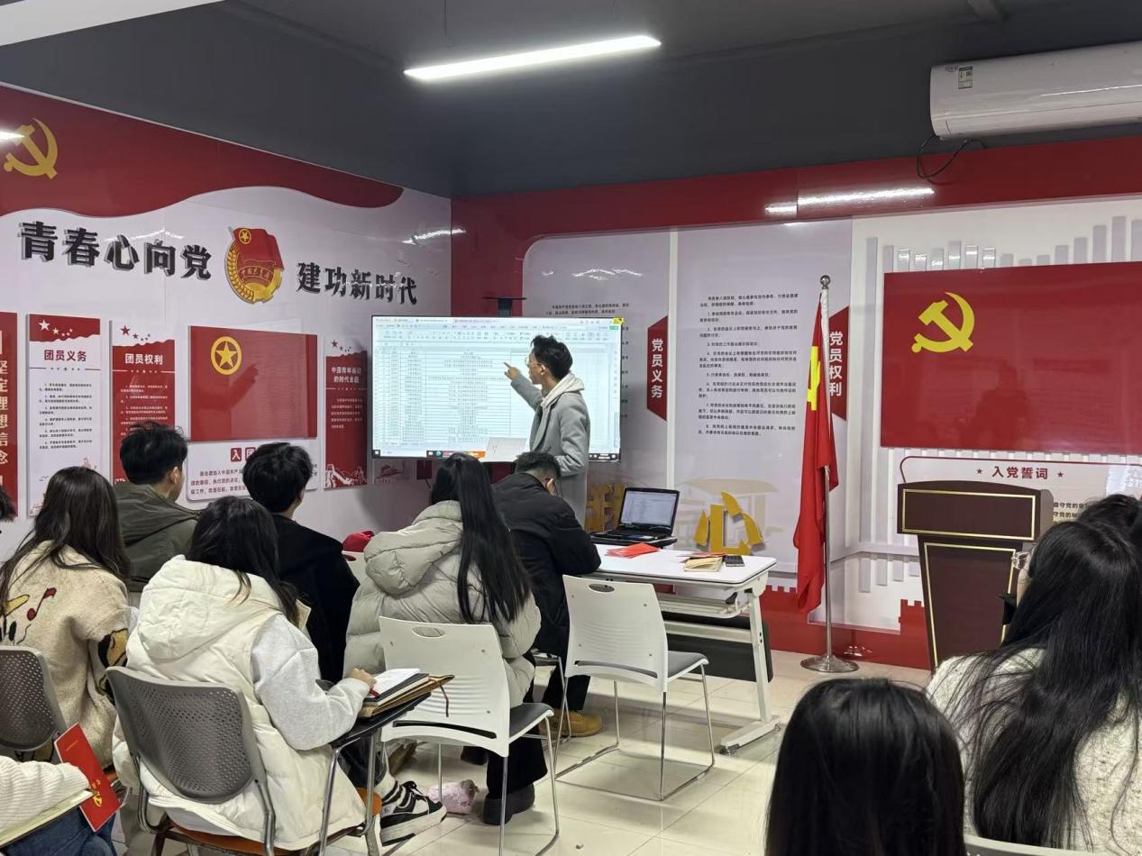 接着,覃江峰老师对本学年以来的支部主题党日活动进行全面汇总与复盘。他系统梳理了学年内理论学习、党性教育、实践服务等各类活动开展情况,总结了党建与专业融合、朋辈互助育人等工作亮点,同时明确了后续党建工作的优化方向。