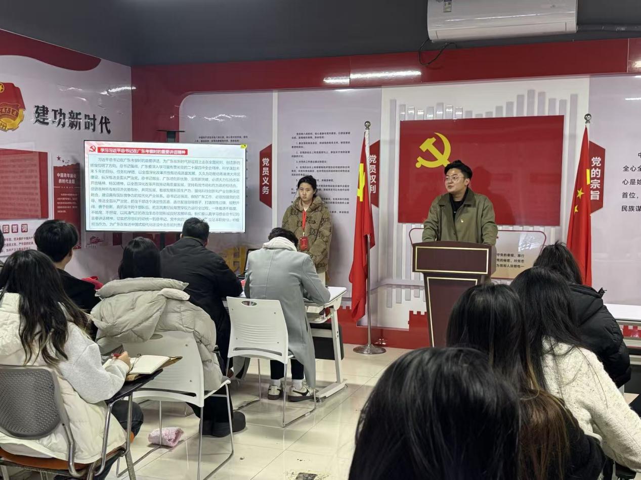 接着,付言杰老师带领全体党员深入学习习近平总书记在广东考察时的重要讲话精神。强调党员要立足传媒专业,主动对接时代需求,将讲话精神转化为专业学习和服务社会的实际行动。
